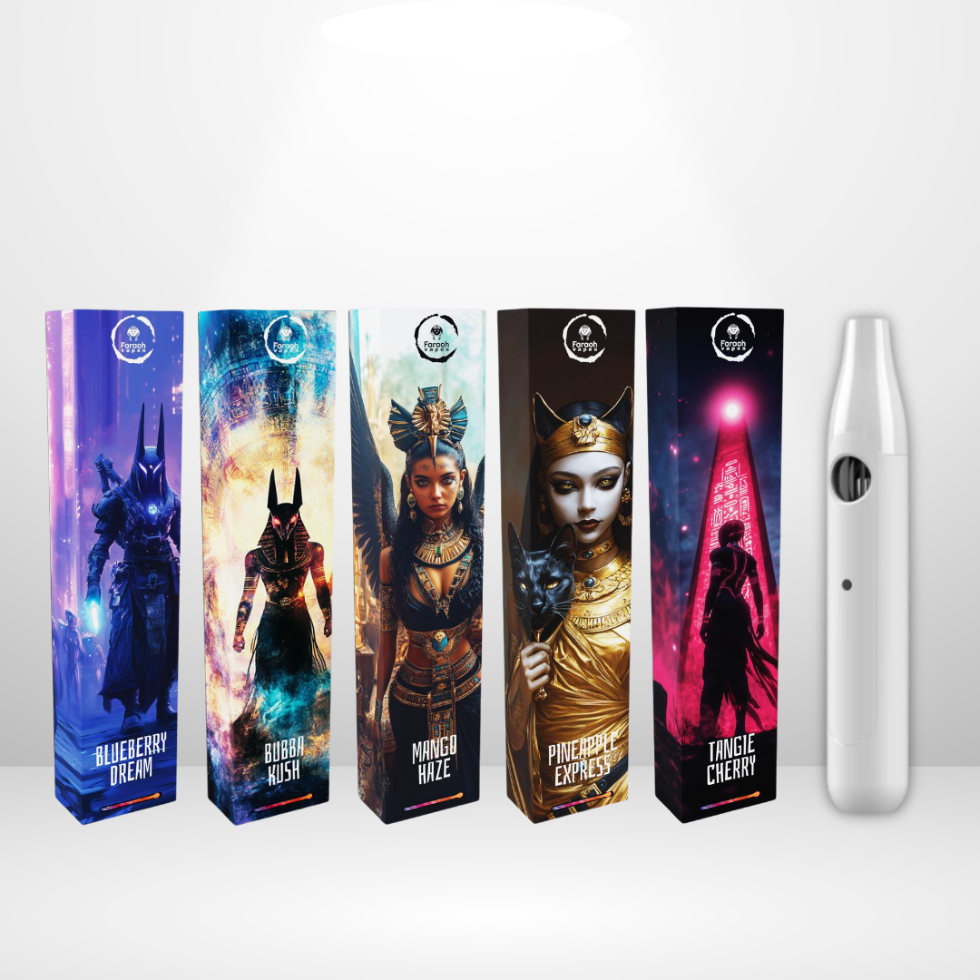 Utforska premiumvaping på nästa nivå med Faraohs exklusiva 3-pack bundle – nu med 25 % rabatt! Välj tre enheter och upplev den perfekta balansen mellan kraft, smak och elegans. Varje vape innehåller en avancerad cannabinoidprofil med 35 % THCB, 25 % THCHO och 35 % CBG, berikad med 5 % naturliga terpener för en fyllig, autentisk smakupplevelse.